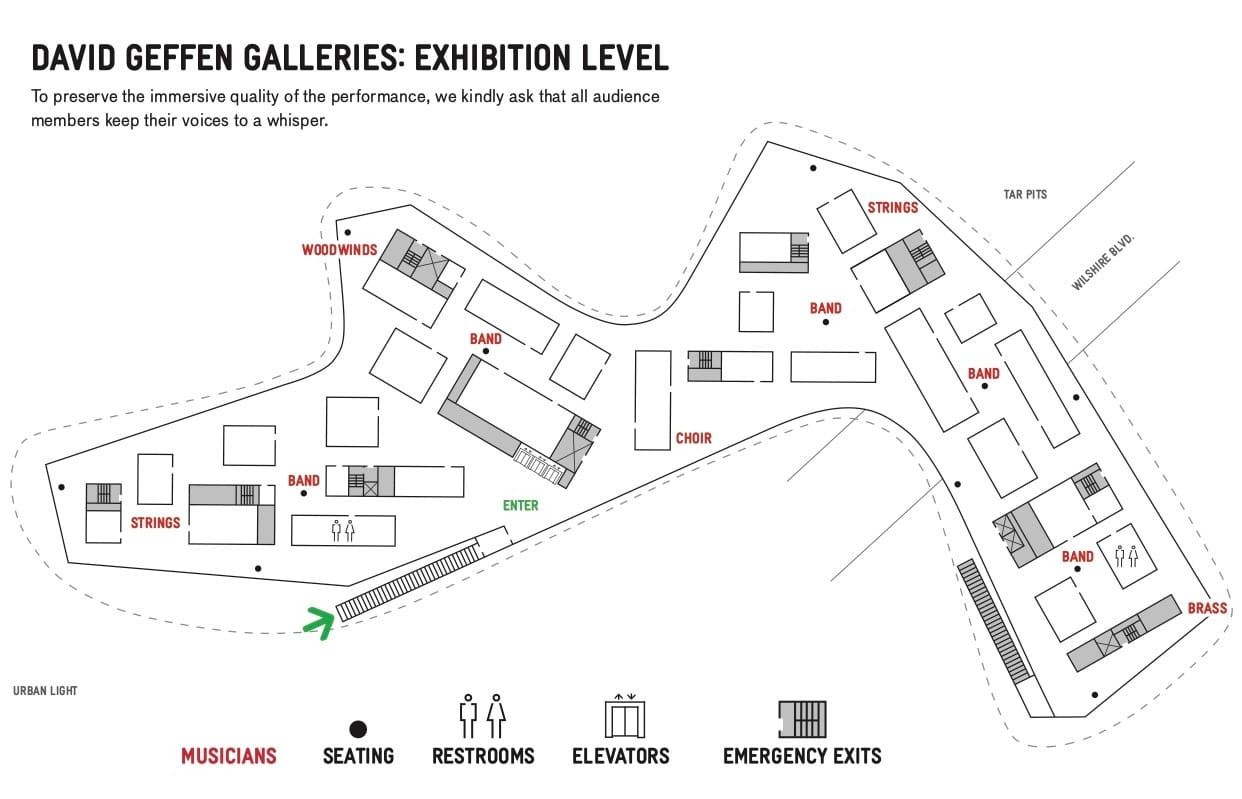 For this occasion, the six-song suite was spatialized within the Geffen's empty galleries, placing ten groups of musicians in stations and leaving a distracted audience to wander as they pleased. In a main thoroughfare, a septet led by Washington himself quickly became the centre of attention, while people came and went from other rooms with greater frequency, visiting choral, woodwind, brass, and string ensembles in relative isolation.