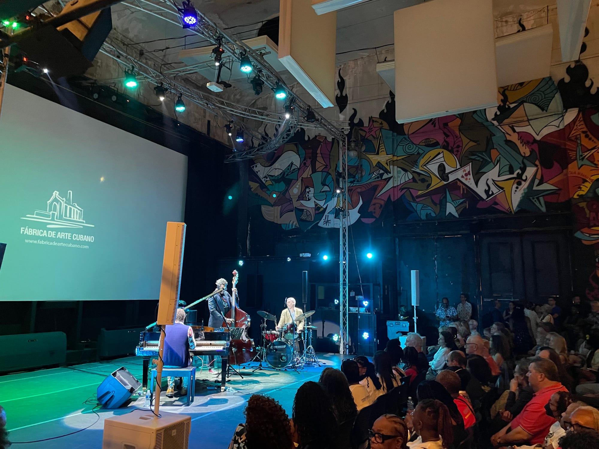 At La Fábrica de Arte, a converted cooking oil factory, one admission gives you access to a range of bars and venues—from high-ceilinged and muralized halls to crowded shipping containers and catwalks. The space is labyrinthine, and a destination in itself. But the experiential aspect of the evening poses some problems for performers, where a superb (and surprisingly outre) Jackie Terrasson trio was forced to compete with the clatter of a distracted crowd—seemingly cutting their set short for lack of attention. I know some lyrical Terrasson records from the 90s, but this group, featuring two Paris-based Cuban musicians, bassist Felipe Cabrera and drummer Lukmil Pérez, is far more exploratory. Terrasson operated percussively on his piano, channeling Afro-Cuban rhythms in a breakaway duet with Pérez, and Cabrera's searching solos seemed to clear a path through the bar's clamour.