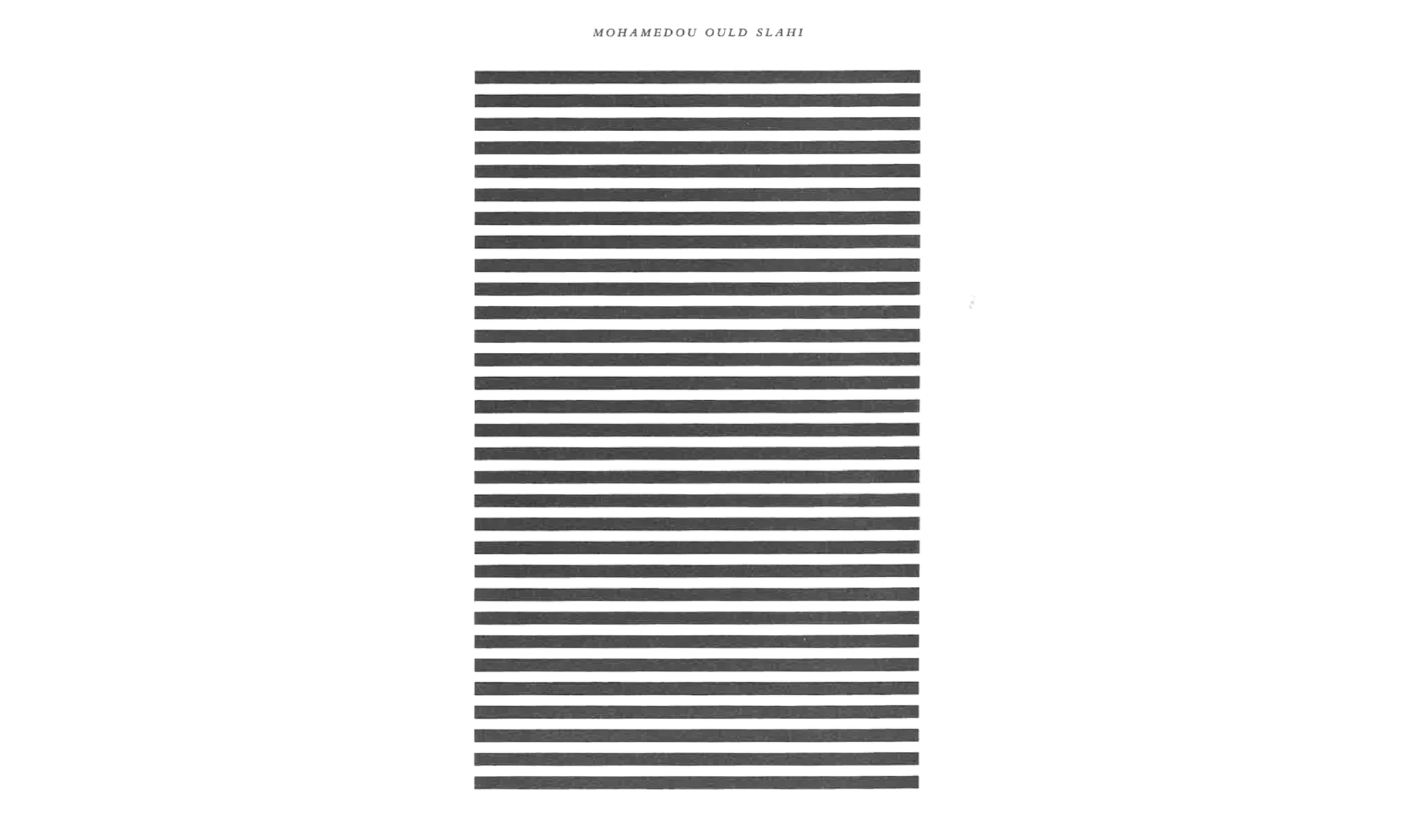 Scott’s own journal opens with a meditation on Mohamedou Ould Slahi’s Guantánamo Diary, in which Slahi recounts a poem shared during an interrogation session. In the text, this poem appears as a full page of solid black lines, like closed blinds or horizontal bars, extending margin to margin. No words protrude, but this visual silence implies a flush poetry on the other side of its extinguishment.