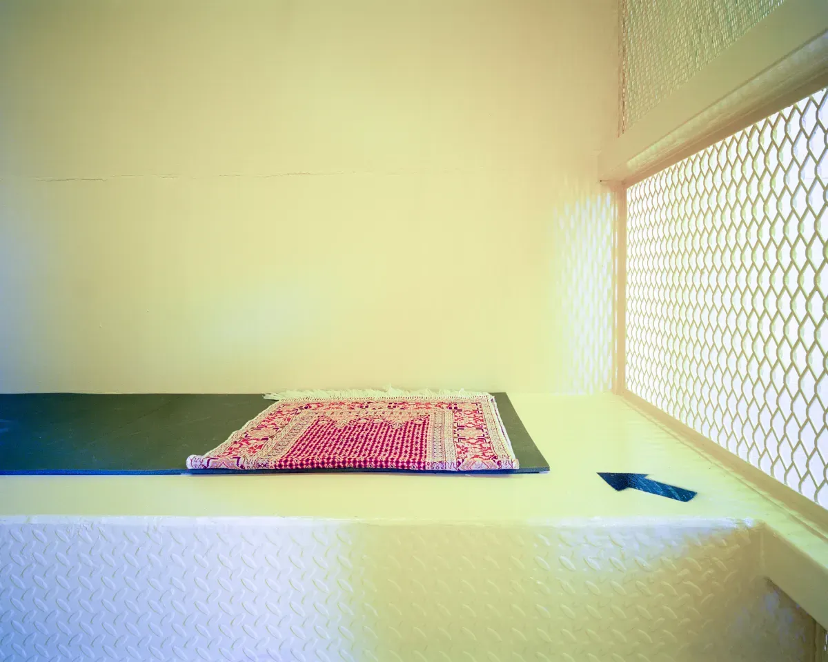 Such vetting infiltrates the content of the pictures, too, where Cornwall's photographs depict only the facility itself, leaving the viewer to imagine all that its walls have witnessed. As with the prisoner artwork, where every artefact represents the physical persistence of its creator, sentimental objects stand in for inmates—prayer rugs and clothing laid out for the day, or toiletries and other minimal personal effects. These scenes are intimate and ominous at once, alluding to the smallest rituals but plausibly abandoned, as if the remaindered property of the disappeared.
