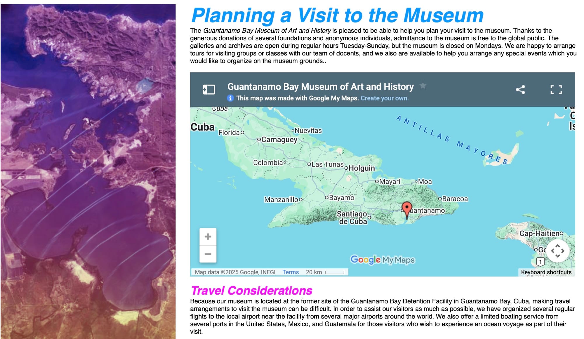 Altheimer's proposal to transform the prison facility into an installation of sorts borrows precedent from many processes of institutional reckoning the world over, though other such artistic visions of Guantánamo propose a bureaucratic counterforce to the occupation on its own terms. The Guantánamo Bay Museum of Art and History, a fictional online gallery by artist Ian Alan Paul, describes a range of unrealized conceptual works corresponding to the methods deployed in the prison and to its commemoration. Likely modelled on the transformation of carceral space throughout Chile after Pinochet, this piece of conceptual web art places itself in a counterfactual timeline where Obama made good on his pledge to close the prison doors once and for all: