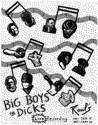 Better still, this righteous negativity was always backed by a raucous party atmosphere, particularly in the recordings of the classic Austin lineup. From the shabby singalong of 'Anti-Klan (Pt. 2)' to the seemingly interminable punk-funk coda of 'Dicks Can't Swim,' Kill from the Heart feels like a compilation of musical highlights from a bleary, all-night hang. This oppositional sociality is better evidenced on the essential Live At Raul's Club album, a split with their fellow travellers in the Big Boys—one of very few punk bands who could hold their own next to the Dicks in terms of idiomatic depth, or why not, soul.